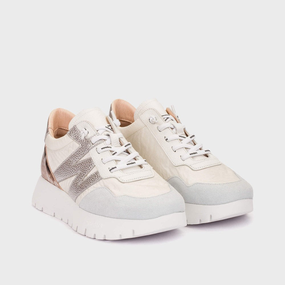 Povzneste svoj mestský štýl s ikonickým modelom španielskej značky Wonders. Tenisky A-24100 v sofistikovanej farebnej kombinácii Off/Plata sú navrhnuté pre modernú ženu, ktorá odmieta robiť kompromisy medzi dizajnom a pohodlím. Jemná smotanová koža v kontraste s metalickými striebornými detailmi vytvára svieži, luxusný vzhľad, ktorý dokonale doplní váš jarný aj letný šatník.