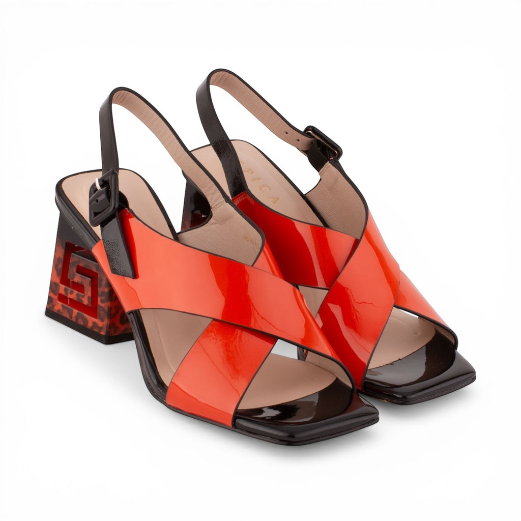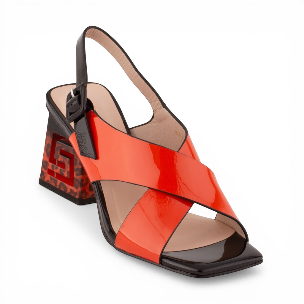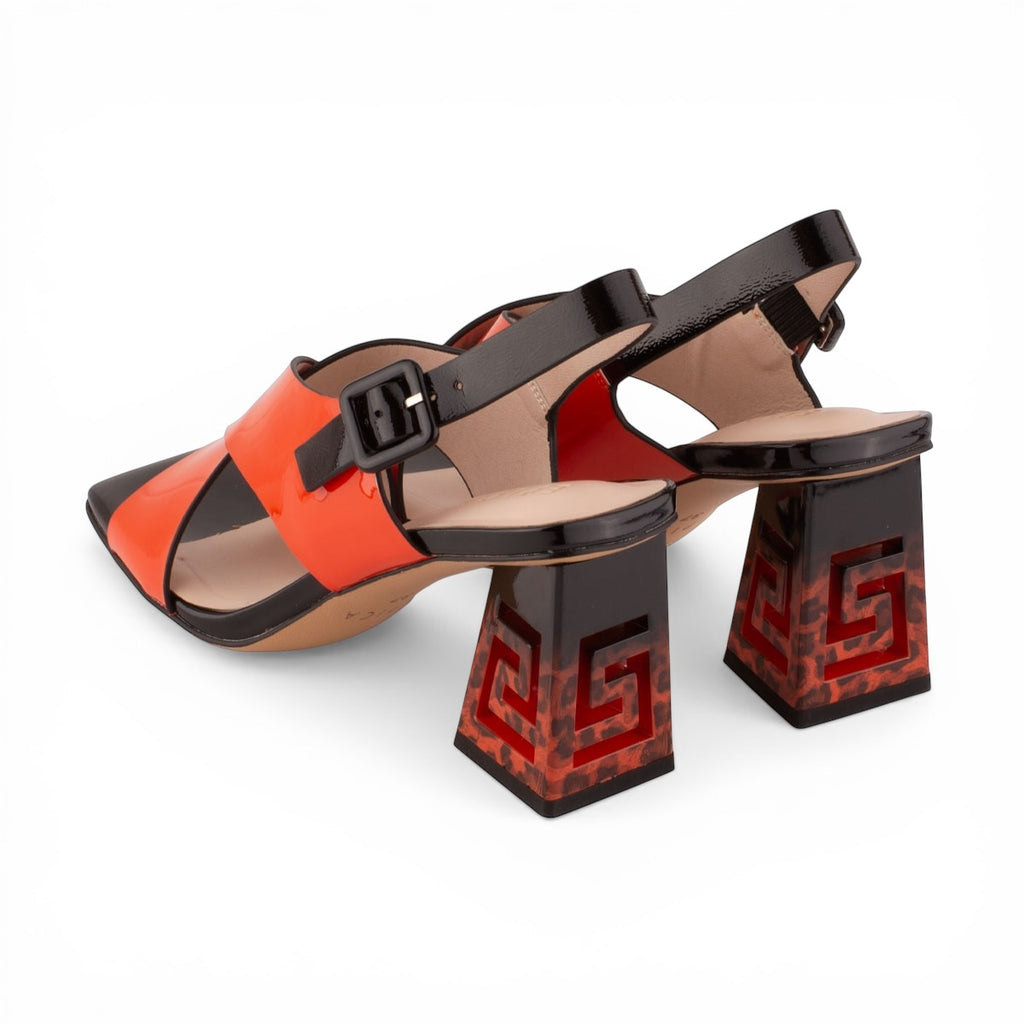 Dizajn: Prekrížené široké remienky na priehlavku, ktoré poskytujú dobrú stabilitu chodidla. Najvýraznejším prvkom je umelecky spracovaný podpätok s výrezom v tvare gréckeho kľúča (meandru) a leopardím vzorom.