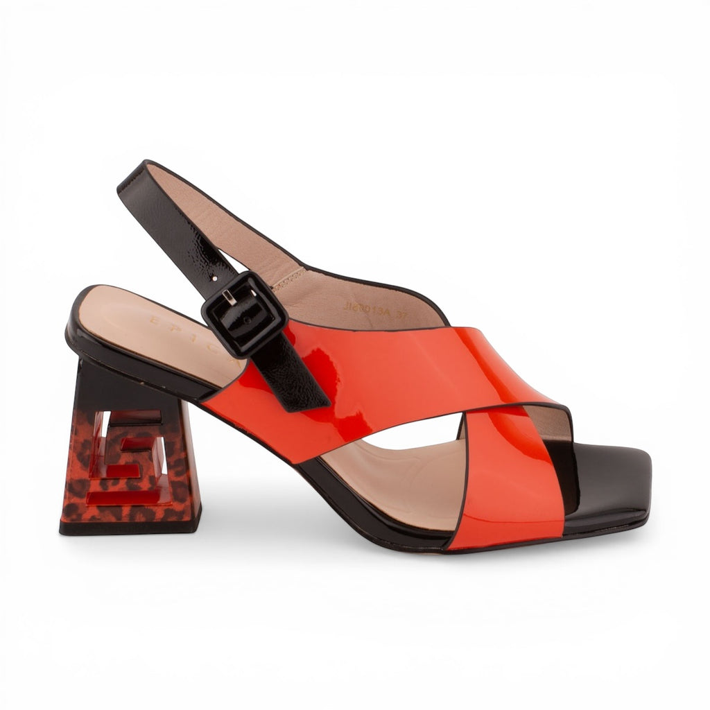 Model: Lakované kožené sandále s otvorenou špičkou a pätou.