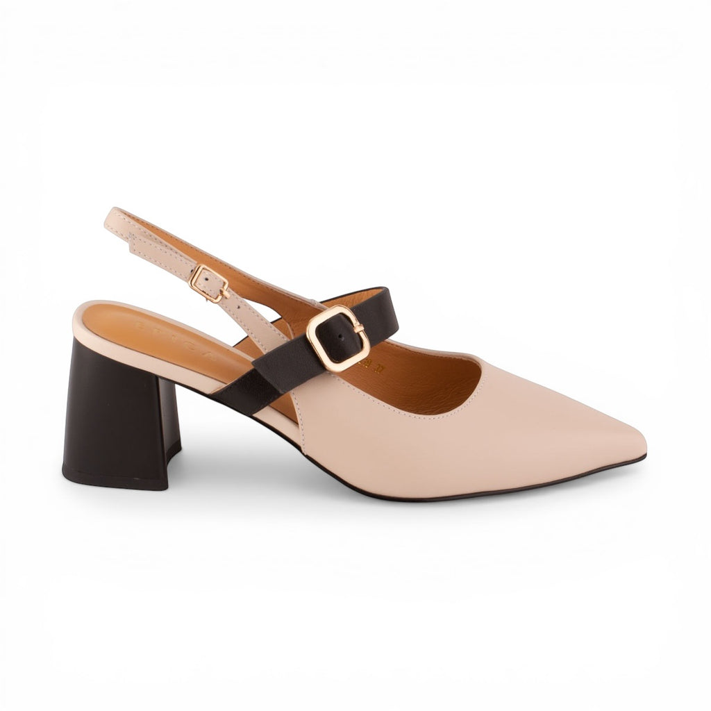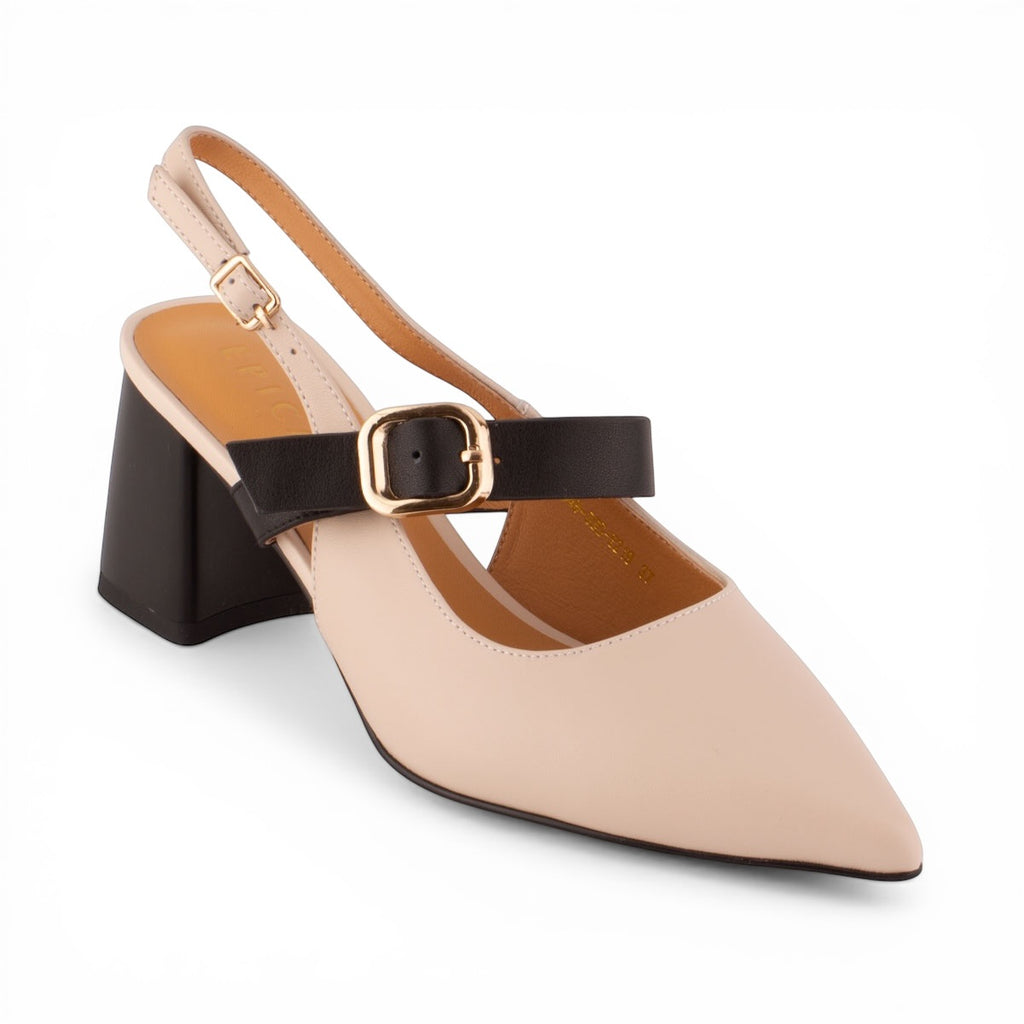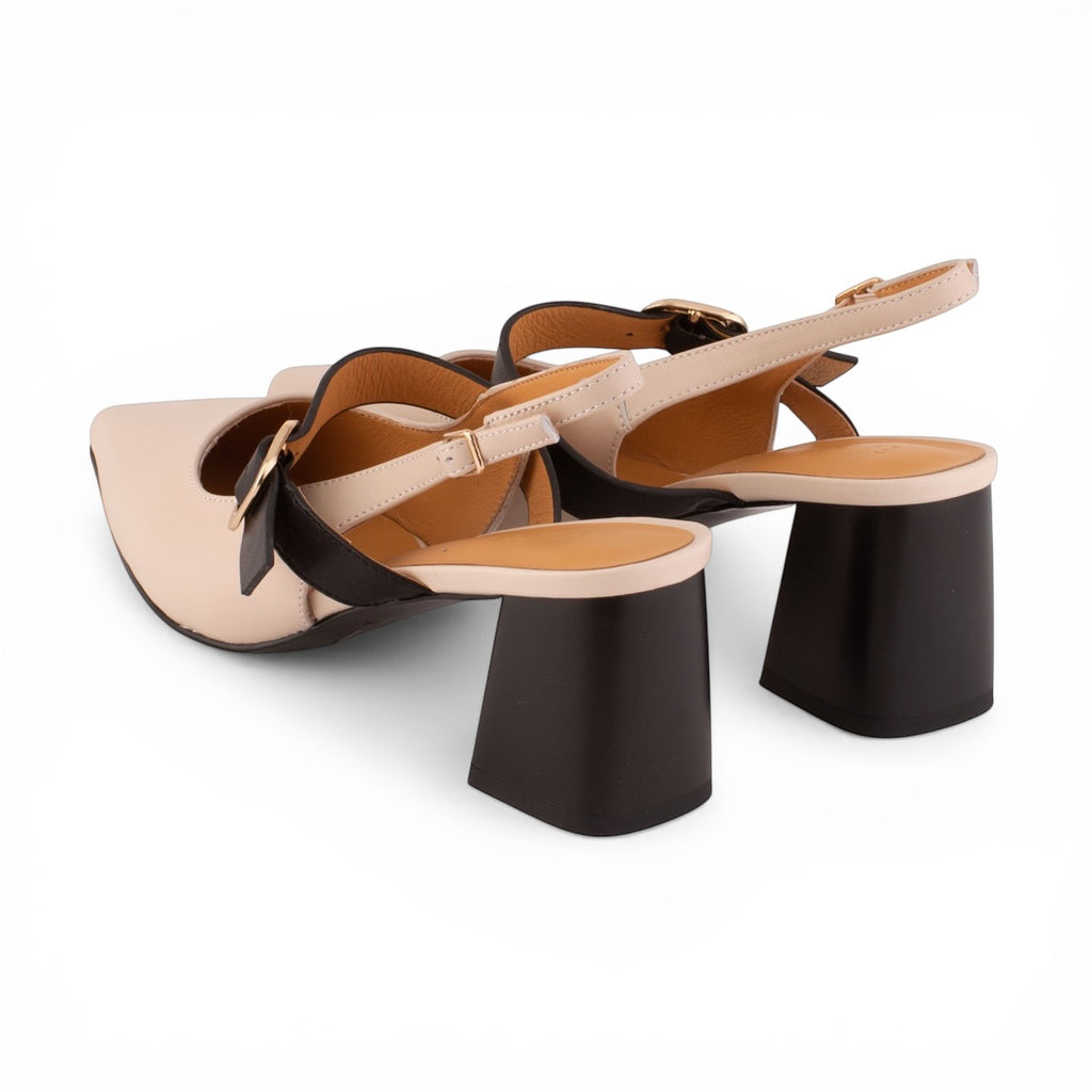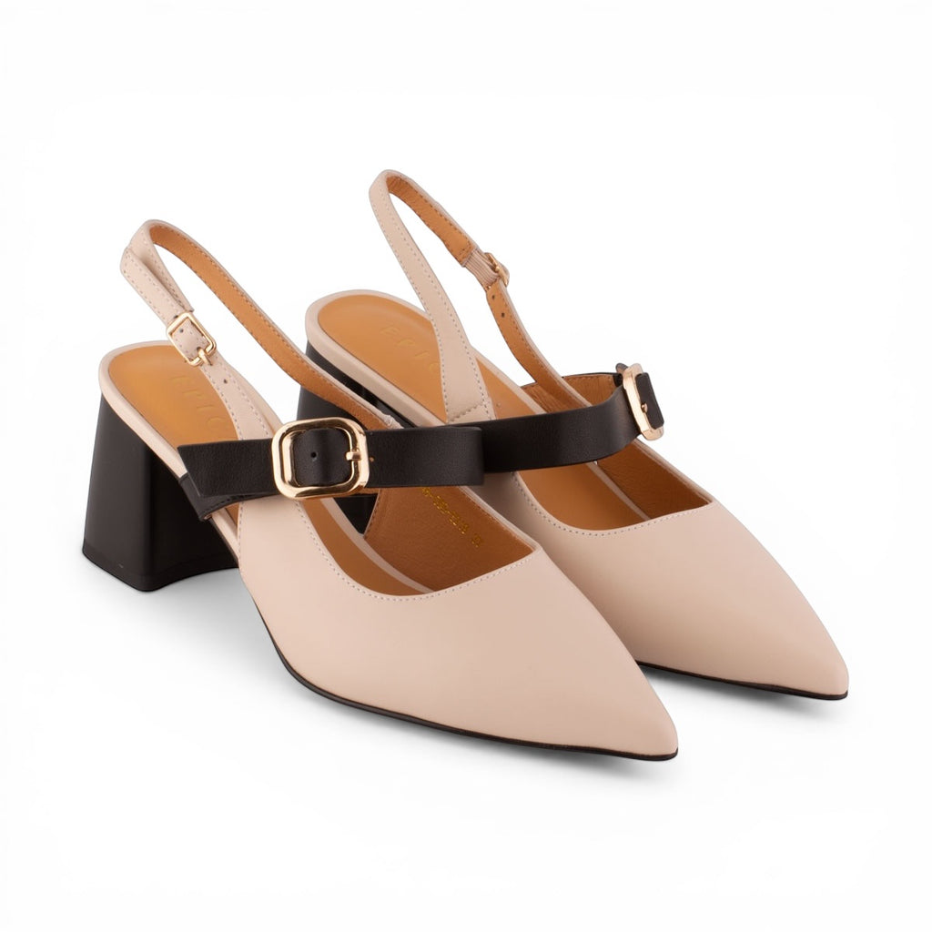 Farba: Sofistikovaná kombinácia béžovej (nude) a čiernej. Béžové telo topánky dopĺňa čierny podpätok a čierny remienok cez priehlavok.