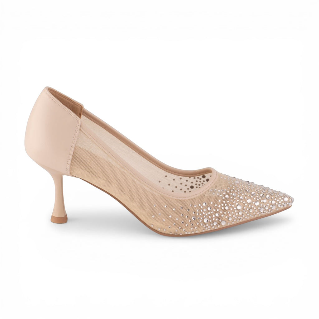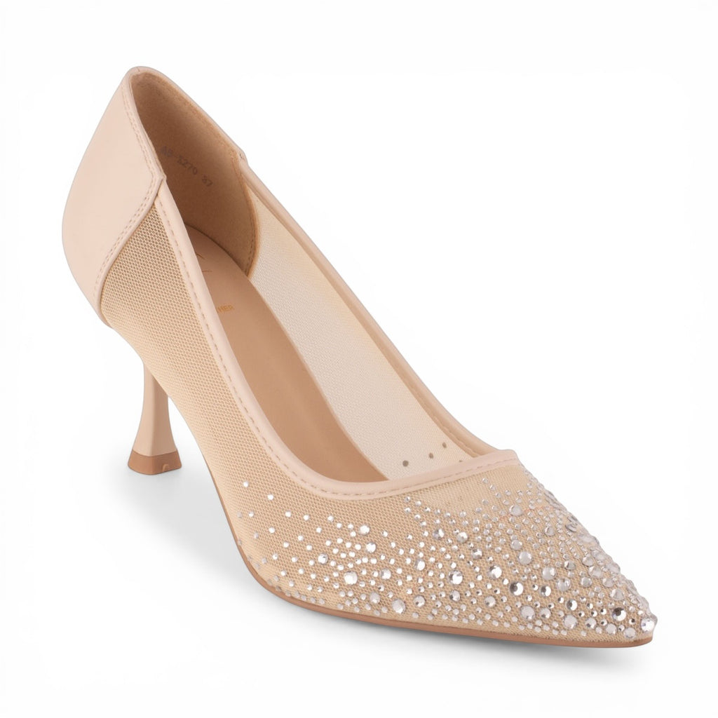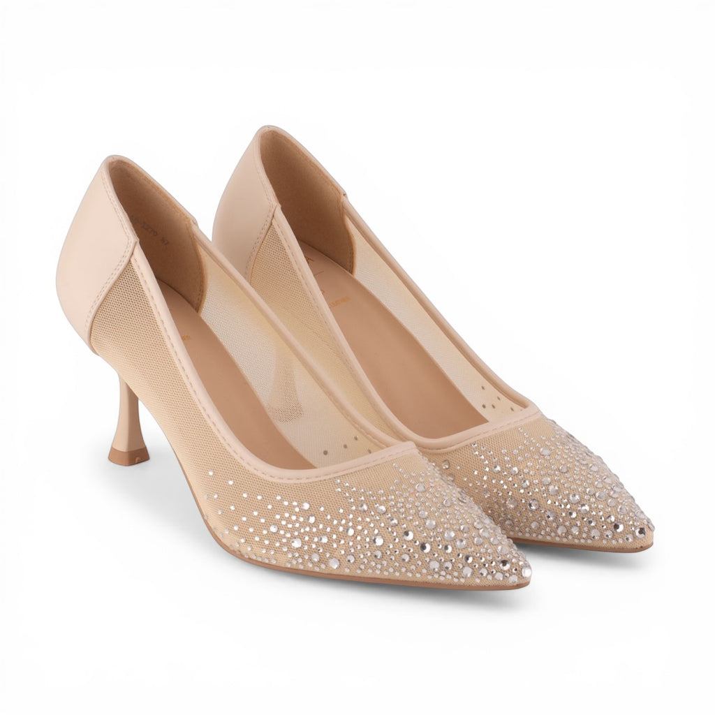 Dizajn: Klasický lodičkový strih so špicatou špičkou (pointed toe). Špička je husto vysadená drobnými brúsenými kamienkami, ktoré smerom k priehlavku prechádzajú do jemného stratena.