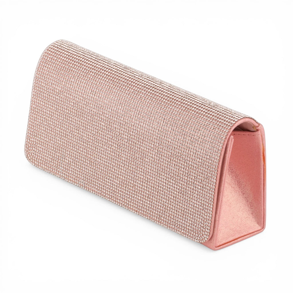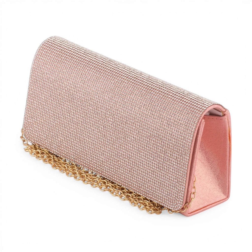 Hľadáte doplnok, ktorý spojí jemnosť s oslnivým glamour štýlom? Táto pevná listová kabelka v tvare obálky je stelesnením luxusu. Jej prednú klopu pokrývajú stovky precízne osadených čírych zirkónov, ktoré pri dopade svetla vytvárajú neprehliadnuteľný „diamantový“ efekt. Jemná púdrová ružová farba v kombinácii so saténovým bočným panelom a zlatou retiazkou robí z tejto kabelky klenot, ktorý oživí každý spoločenský outfit.